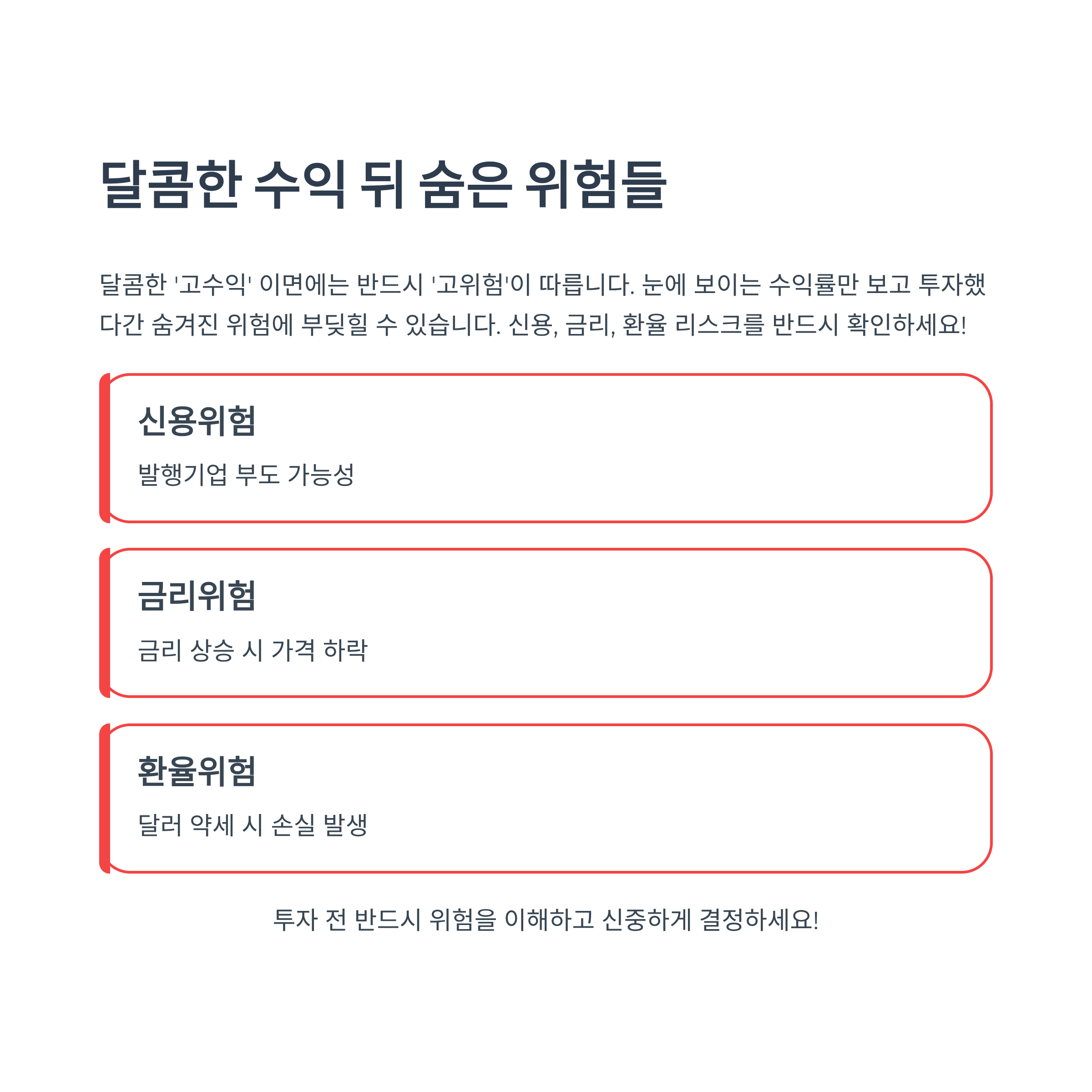 • 금리 리스크: 앞으로 금리가 오르면 채권 가격은 떨어져 손실이 날 수 있어요.